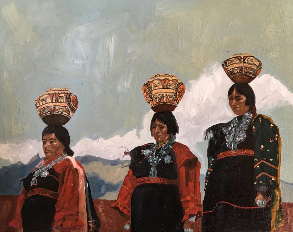 Though you wouldn't guess it, Chloé is new to Western painting. She's been focused on this medium for about a year. "I am a beginner here," she says. Studying and recreating paintings by Western masters like Remington and W.H. Dunton has given her works a classic feel. But it's the details — like patterns on textiles and pottery, or the metallic look of the squash blossom necklaces, or the movement of her brush strokes mimicking the wind — that make her oil paintings stand out from others attempting something similar.