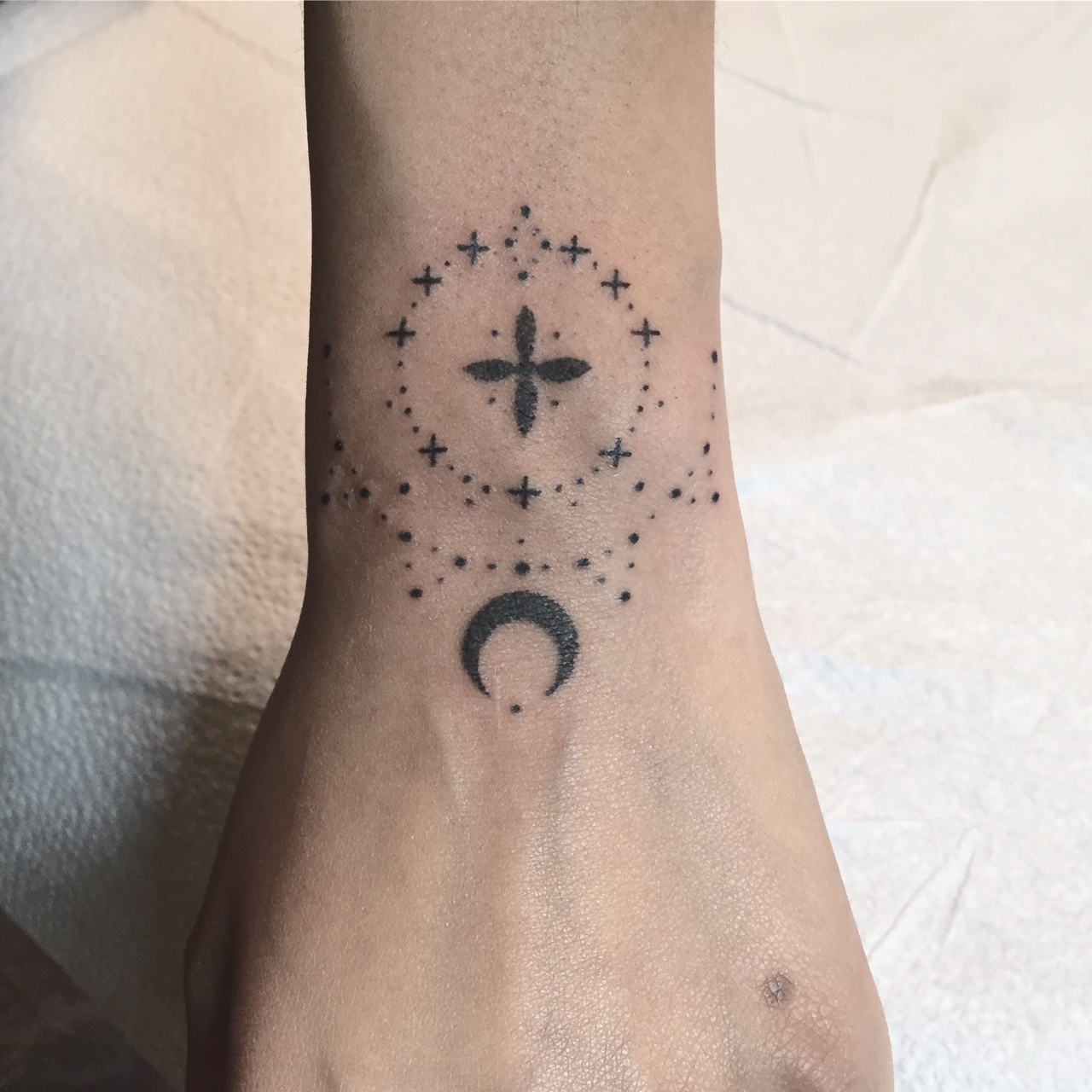 But back to 1998, when I learned how to tattoo, I met a guy who I ended up being friends with for the next 10 years, who liked my tattoos at a festival, and he asked me if I wanted to learn how to hand poke. I said something like, "I don't know, sure." I was open to it; I wasn't one way or the other; but the second that I did it I knew, "Oh, I'm going to do this forever." It's not like I was even thinking about a career then because I just because I didn't have that mentality at all at that time. I was still thinking I was very subversive, and on the fringe, and eating out of dumpsters. So I wasn't thinking, "Oh, this is going to be my career," but I knew once I did it, "I'm going to do this forever. This totally resonates with me."