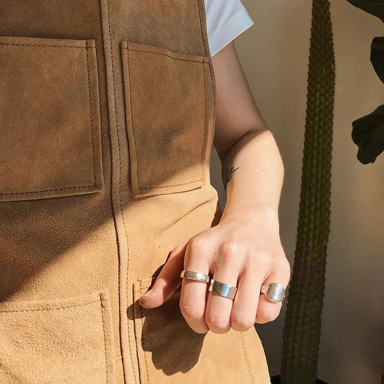 It definitely doesn't boil down to one specific thing or place, and what inspires me constantly changes. I think inspiration arrives in ways I neither expect nor search for. I give and allow it the space to make its way to me when it is ready, and I don't often go out hunting for it with knife in hand unless it's necessary. I am never without it though; I am in constant supply. It is absolutely, everywhere — from a rusted wall in a city street, to native flora in a dry landscape, to the posture a dead animal carcass takes in its final moments. If I feel like my eyes need to rest on something in particular and I am being drawn like a magnet to it, such as the mountains or a snake being eaten by a bird of prey, I will make sure my eyes see it — whether that means I jump in the car and drive to the mountains or search for a video where an eagle steals a snake. Life being lived and life being taken as it should be, in natural ways, is inspiring to me. The constant equations happening around us, additions and subtractions of animal and plant life, is inspiring. Finding a snake skin on a track. A dead falcon on the side of a road. I love the language that life has within itself, and how there are components that humans just cannot touch. The habits of animals and their instinctual needs are something I constantly align with my own. The landscape around me speaks eternally of inspiration, and its whispers are something I will never tune out. If I were to try and focus what my current inspiration is for my silver work, it is weathered and worn items. I am trying to echo in my jewelry the notion that what you are purchasing from me has already had an owner prior to you, akin to when you find a vintage ring and it already has worn properties to it. You, in purchasing a ring, are adding to its journey.