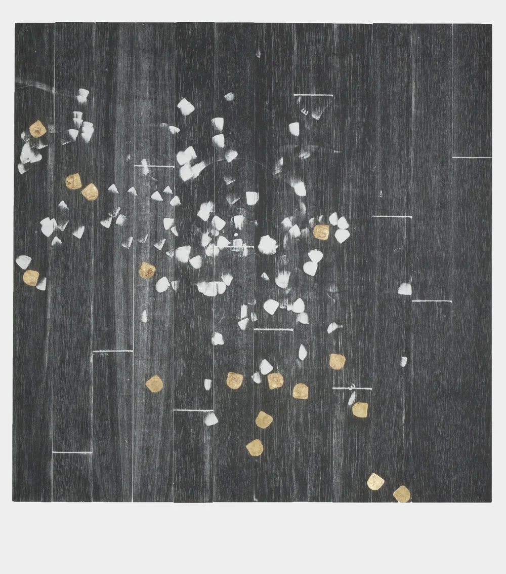 The prints in Isabel's series are made from small balsa wood dance floors, which she builds herself. She collaborates with Flamenco artists, who dance on the soft wood, leaving impressions of their footwork behind. "Clavos" are small nail heads in the soles of Flamenco shoes that help create a strong percussive sound, and they add depth and dimension to the impressions their footprints create on the balsa wood.