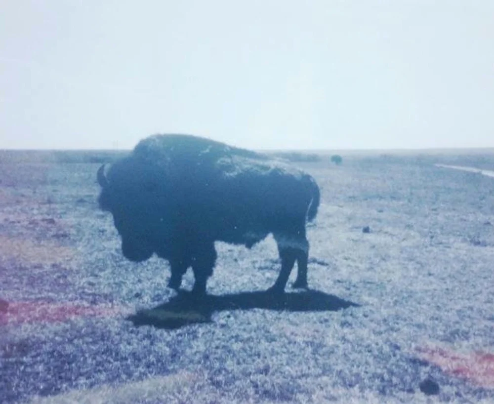 When I didn’t find them readily available along the fences, I nearly gave up on getting my buffalo photo because my car was already packed for California and I was thinking about the long drive ahead the next day — but my mother encouraged me to keep going. We found the long dirt road leading to the ranch, and serendipity met us in the form of a woman with an owl-gray braid down her back, her kitchen screen door wafting out something smelling like the French word for beef, bouef. She invited me to hop in the farm truck and took me from one sprawling field to another, full of bison, more than I could count. I was intoxicated by scenes that could have been plucked out of Dances with Wolves. We opened and closed gates, taking unmarked roads through sweet prairie grass till we reached the very last and highest field. My truck driver nodded to the behemoth standing in front of me, “He can see everything from here.” Two thousand pounds of bouef. Horns like cracked marble. Eyes looking out over the herd. Ugly. Beautiful.